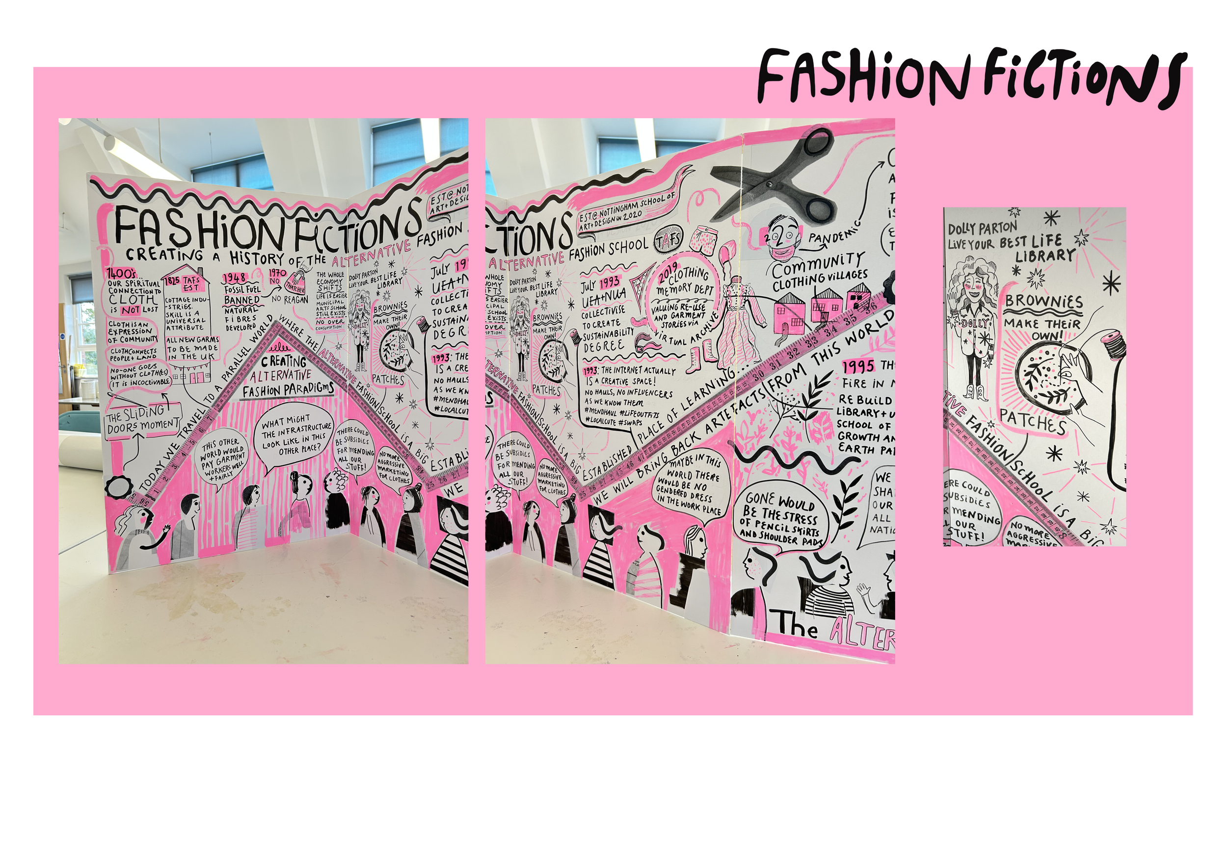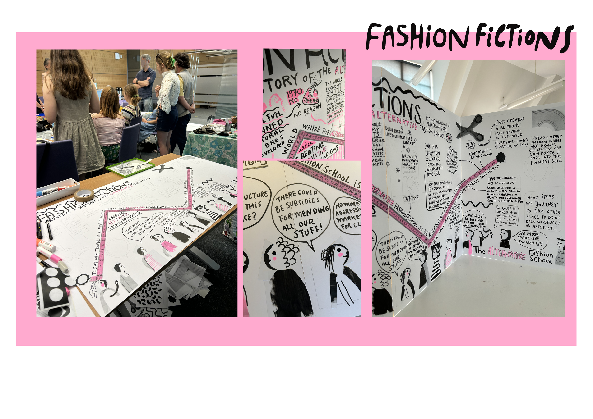 LIVE ILLUSTRATION at FASHION FICTIONS, with THE ALTERNATIVE FASHION SCHOOL Listening in and capturing group research, discussions and imaginative development of an alternative reality - in which we are sustainable as humans and value garment workers and cloth. working with TAFS, part of WasteSmiths. 3 X A2 boards, assembled as one board