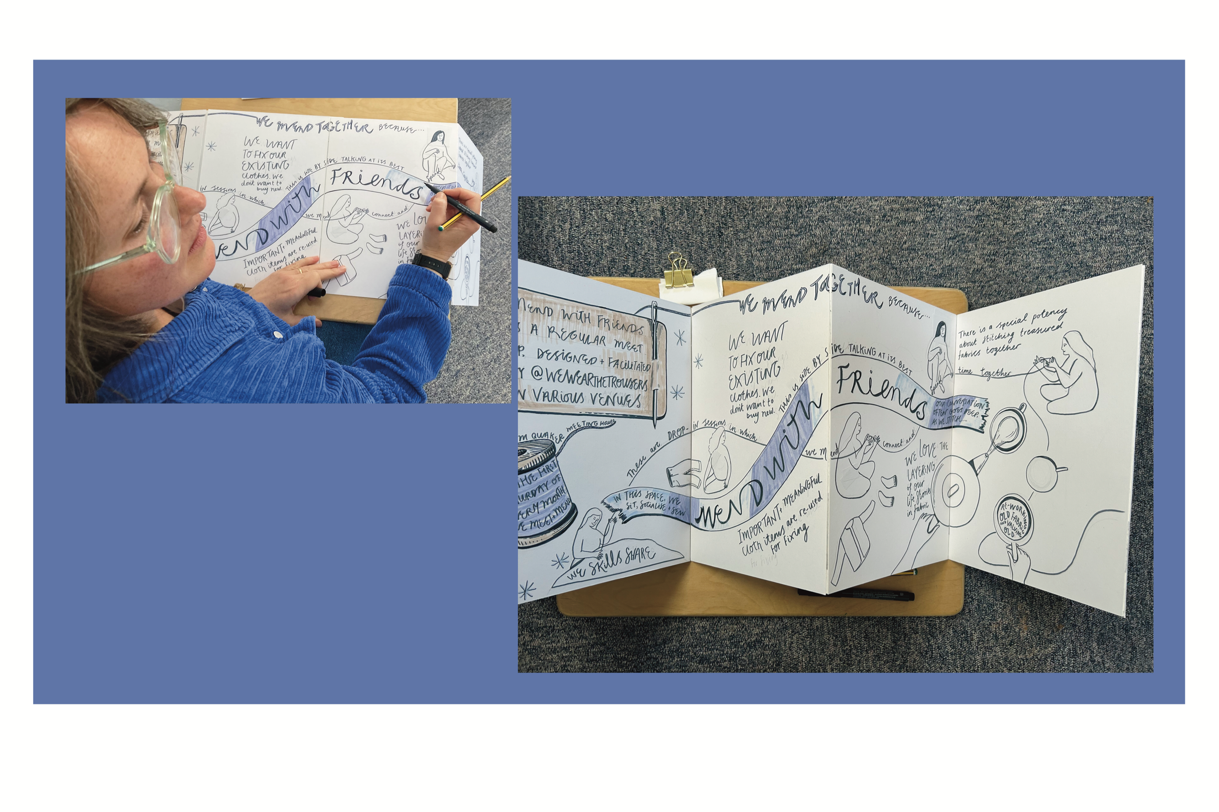 LIVE ILLUSTRATION: Local Sewing-Social, capturing discussions amongst a multigenerational group of women who meet regularly to mend clothes (and chat and drink tea). Concertina book